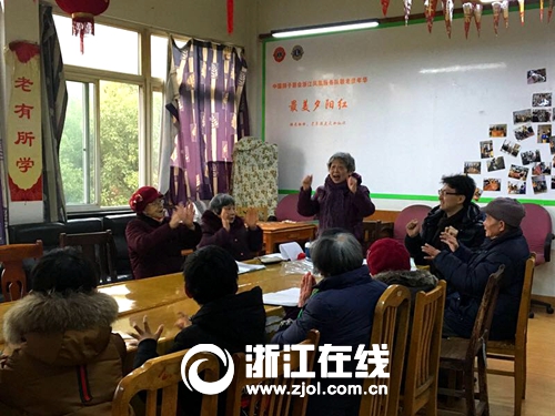 “爱国国富强、平等想自由,构建和谐把法治遵守;核心价值融进言行里,太阳为我打一个鲜红的红勾……”1月20日上午九点钟,吴兴区朝阳街道碧浪湖社区里的老年公寓里传来阵阵歌声和掌声,30多位高龄老人和着音乐,在“音乐指导老师”的指挥下唱着曲子打着节拍。唱歌的间隙,这位“音乐指导老师”还会一直走动,走到每位老人面前,帮他们翻看歌词,鼓励他们跟上节奏,现场传递着欢声和笑语,一片热闹的景象。然而这位“音乐指导老师”也是一位80岁的老人,她就是碧浪湖社区老年公寓志愿者林景平。